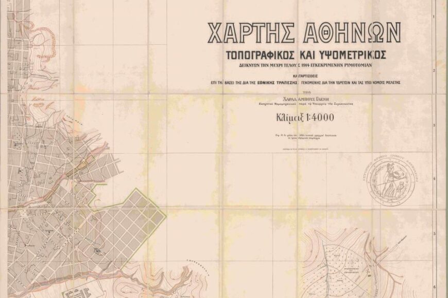 Χάρτης Αθηνών, Τοπογραφικός και Υψομετρικός, δεικνύων την μέχρι τέλους 1914 εγκεκριμένην ρυμοτομίαν. Καταρτισθείς επί τη βάσει της δια της Εθνικής Τραπέζης γενομένης δια την ύδρευσιν και τας υπονόμους μελέτης, υπό Χαραλάμπους Γλένη, εισηγητού νομομηχανικού παρά τω Υπουργείω της Συγκοινωνίας. Κλίμαξ 1:4000. Εξετυπώθη εν τω λιθογραφείω Β.Παπαχρυσάνθου εν Αθήναις.