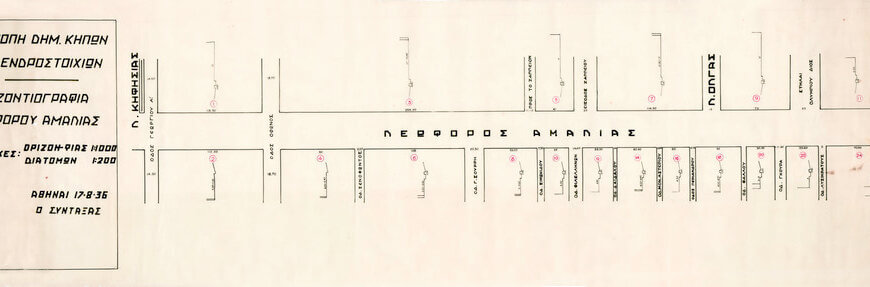 Αρ.σχ. 51. Οριζοντιογραφία Λεωφόρου Αμαλίας, Αθήναι 17 Αυγούστου 1936. Σχέδιο της Επιτροπής Δημοσίων Κήπων και Δενδροστοιχιών, κλ.1:1000 (οριζον/φία) και 1:200 (διατομές). Μαύρο και κόκκινο μελάνι σε διαφάνεια 31×105 εκ.