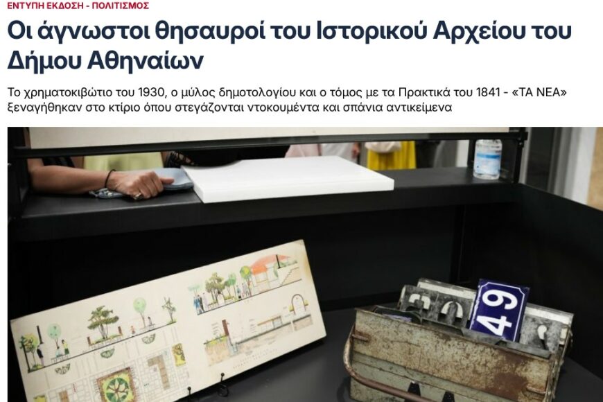 Η εφημερίδα τα «ΤΑ ΝΕΑ» και η δημοσιογράφος Εύη Σαλτού ξεναγήθηκαν στο κτίριο και στις συλλογές του Αρχείου. Δείτε το δημοσίευμα με τίτλο «Οι άγνωστοι θησαυροί του Ιστορικού Αρχείου του Δήμου Αθηναίων» που δημοσιεύθηκε στο φύλλο της Τρίτης εδώ.