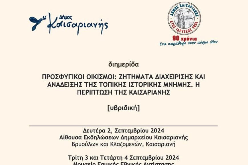 Συμμετοχή στη διημερίδα Προσφυγικοί οικισμοί: Ζητήματα διαχείρισης και ανάδειξης της τοπικής ιστορικής μνήμης. Η περίπτωση της Καισαριανής / 2 Σεπτεμβρίου 2024