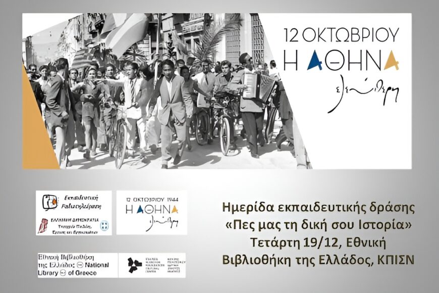 Στο πλαίσιο της διοργάνωσης «12 Οκτωβρίου 1944. Η Αθήνα Ελεύθερη», οργανώνεται για τη μαθητική δράση «Πες μας τη δική σου Ιστορία» επιμόρφωση εκπαιδευτικών, αρχής γενομένης από Ημερίδα – Εργαστήριο, που θα πραγματοποιηθεί την Τετάρτη 19 Δεκεμβρίου 2018 στον Πύργο Βιβλίων της Εθνικής Βιβλιοθήκης της Ελλάδος στο Κέντρο Πολιτισμού Ίδρυμα Σταύρος Νιάρχος (ΚΠΙΣΝ).