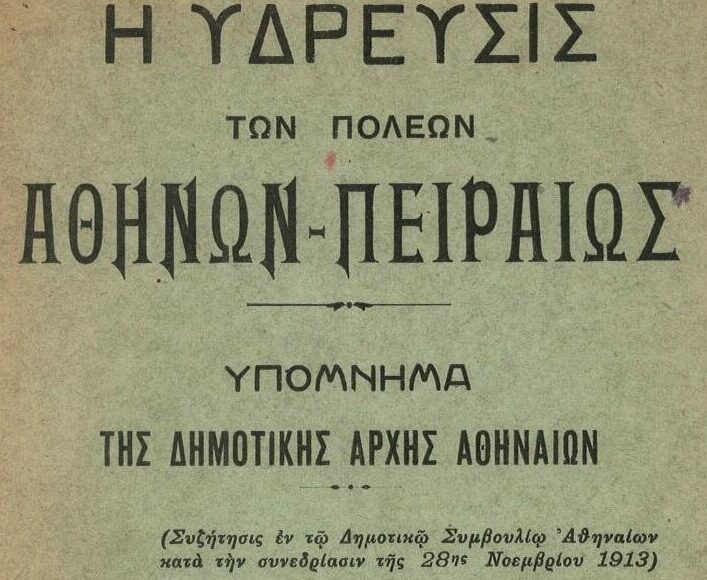 Υπόμνημα της Δημοτικής Αρχής σχετικά με την ύδρευση των πόλεων Αθηνών – Πειραιώς, στο πλαίσιο επικείμενης συζήτησης στη Βουλή σύμβασης για την αντιμετώπιση της λειψυδρίας που ταλάνιζε διαχρονικά την περιοχή της Αττικής. Το κείμενο περιλαμβάνει αγορεύσεις του Δημάρχου Αθηναίων Σπ. Μερκούρη και Δημοτικών Συμβούλων κατά τη Συνεδρίαση της 28ης Νοεμβρίου 1913, με τις οποίες διατυπώνονται ενστάσεις για τη στάση της Κεντρικής Κυβέρνησης έναντι της Τοπικής Αυτοδιοίκησης, καθώς ο Δήμος Αθηναίων αποψιλώνεται από περιουσιακά στοιχεία, υποδομές και πόρους σχετικούς με το νερό, καλούμενος ταυτόχρονα να αναλάβει νέες υποχρεώσεις (όπως π.χ. η κατάβρεξη των δρόμων) χωρίς να ζητείται καν η άποψή του επί των σχεδιαζόμενων υδροδοτικών έργων.